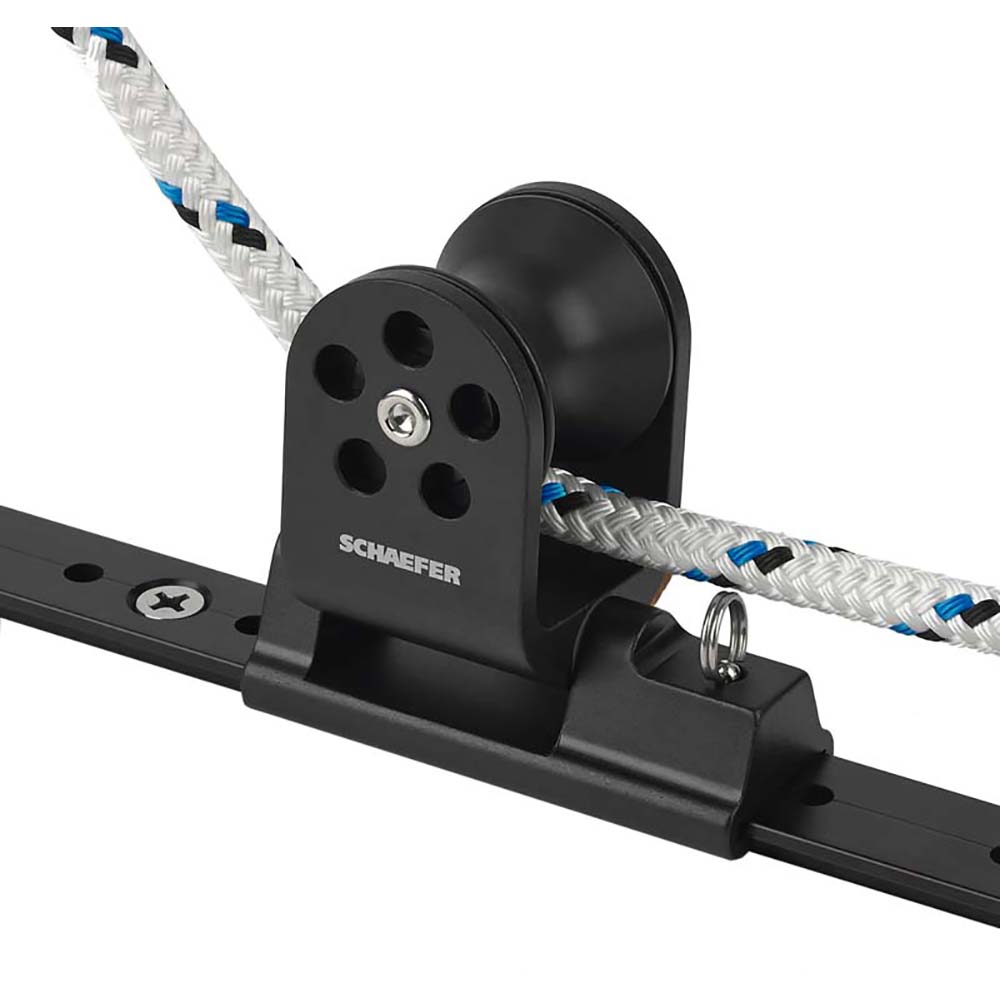 32-77 Twin Sheet Lead block. The anodized aluminum body is machined from 6061-T6 aluminum and articulates to ensure a proper lead. Anodized aluminum sheave runs on Nomex™/Teflon™ bearing for a low-friction high strength sheave. Pin stop makes adjustment simple.